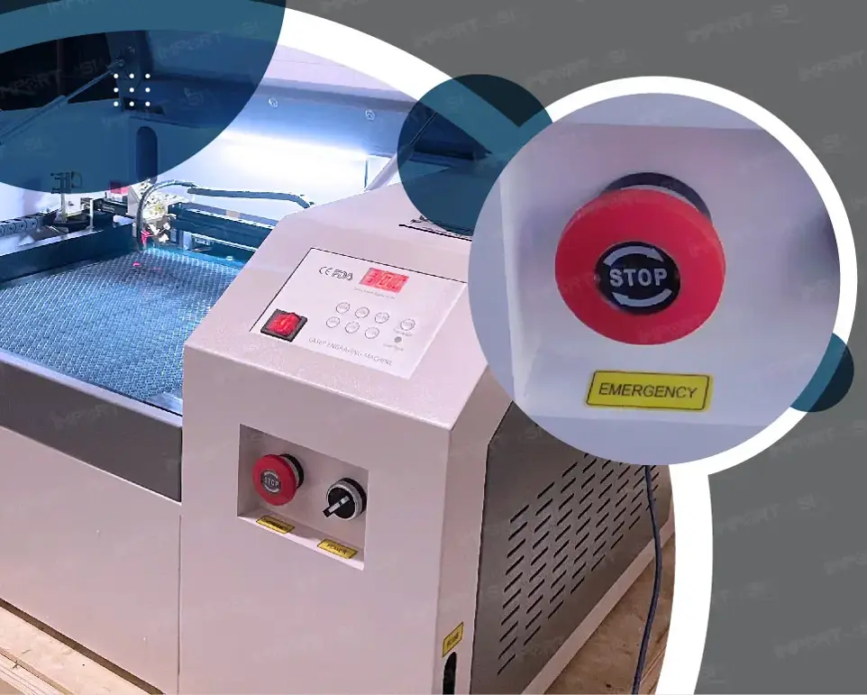 Implementa un botón de emergencia que facilita la detención inmediata del láser ante cualquier situación inesperada.