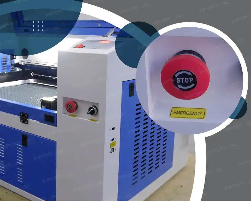 Implementa un botón de emergencia que facilita la detención inmediata del láser ante cualquier situación inesperada.