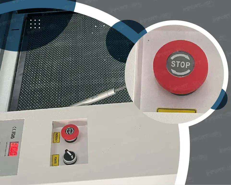 Implementa un botón de emergencia que facilita la detención inmediata del láser ante cualquier situación inesperada y de riesgo.